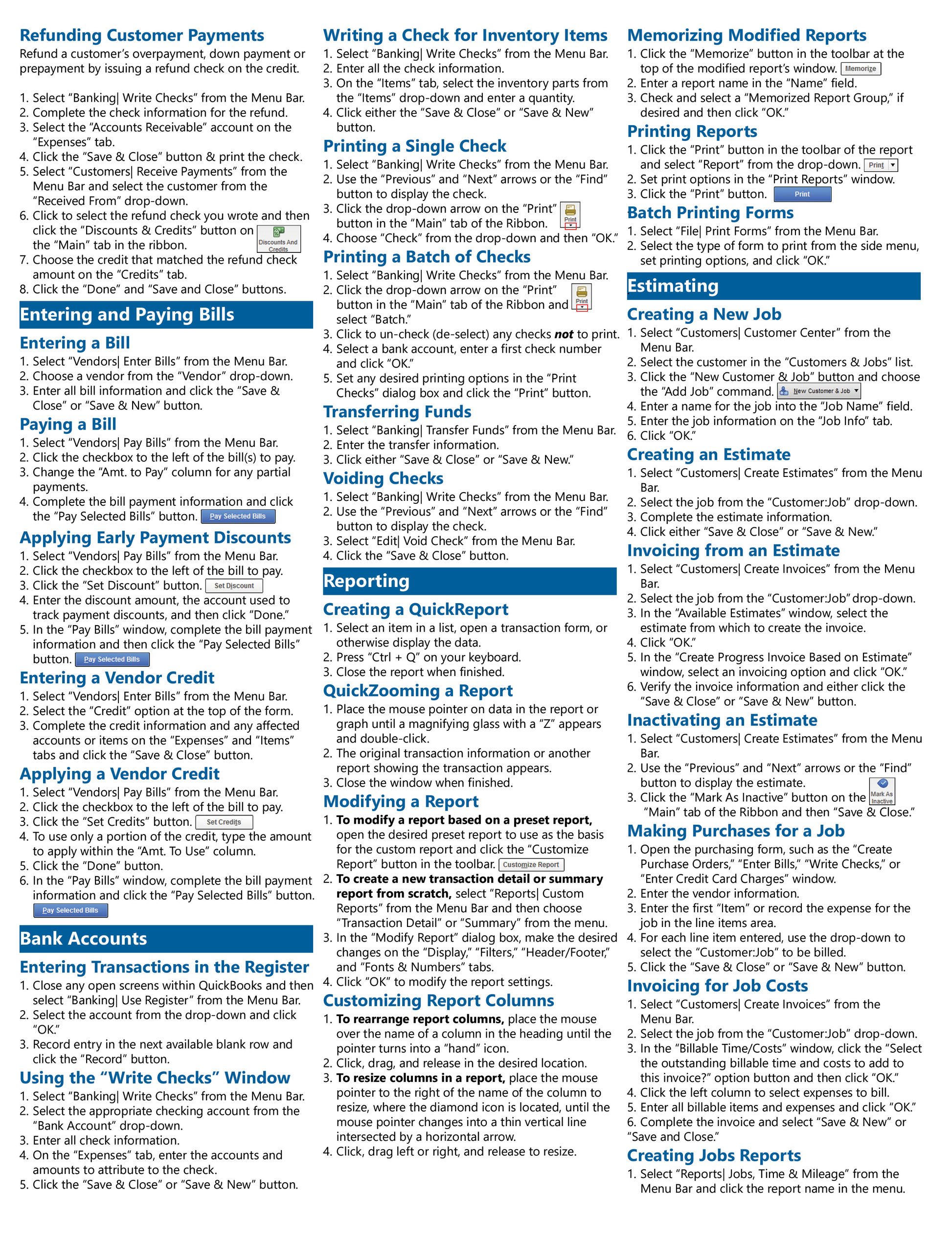 Designed with the busy professional in mind, this 4-page quick reference guide provides step-by-step instructions in QuickBooks Pro 2014. When you need an answer fast, you will find it right at your fingertips. Clear and easy-to-use, quick reference cards are perfect for individuals, businesses and as supplemental training materials.